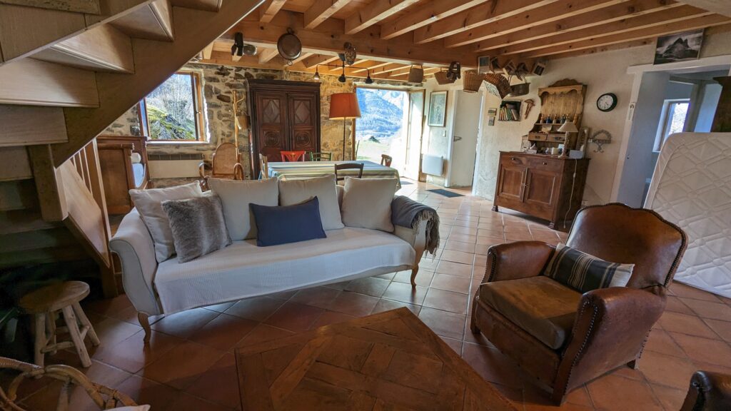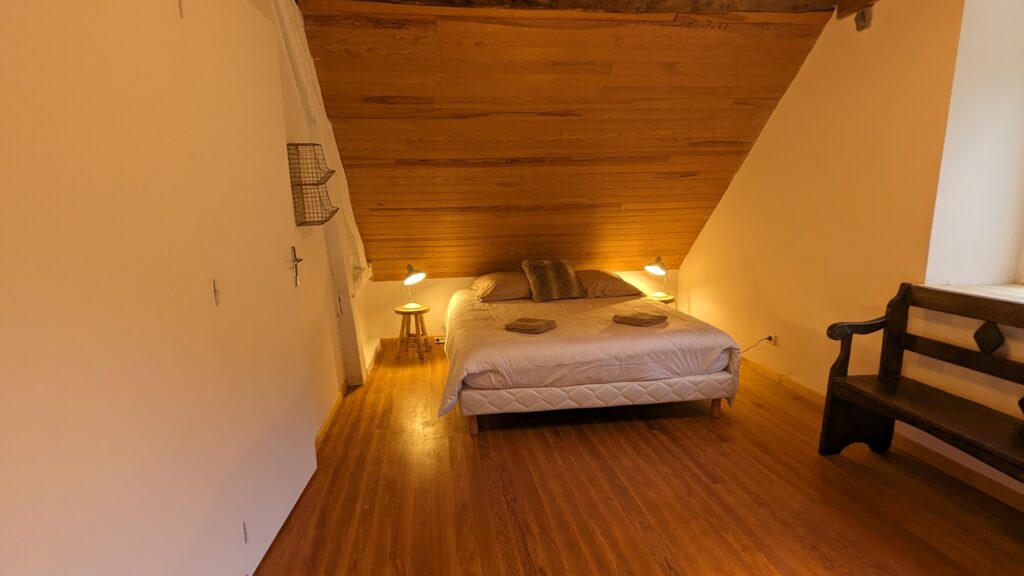 A l’étage, une première grande chambre équipée d’un lit double et orientée au soleil couchant offre une vue magnifique sur Ansabere et le Dec de lhurs.
