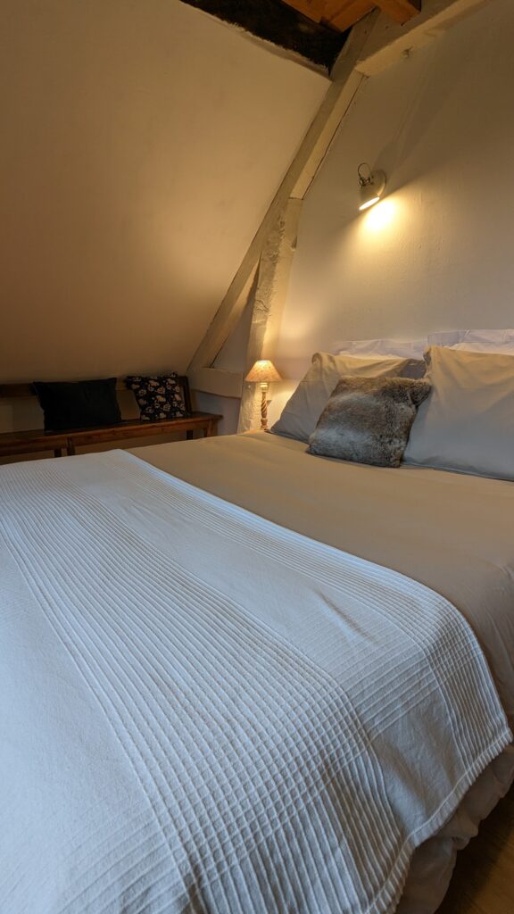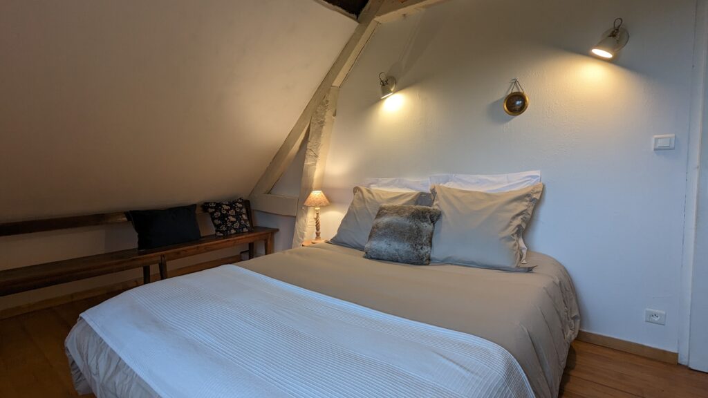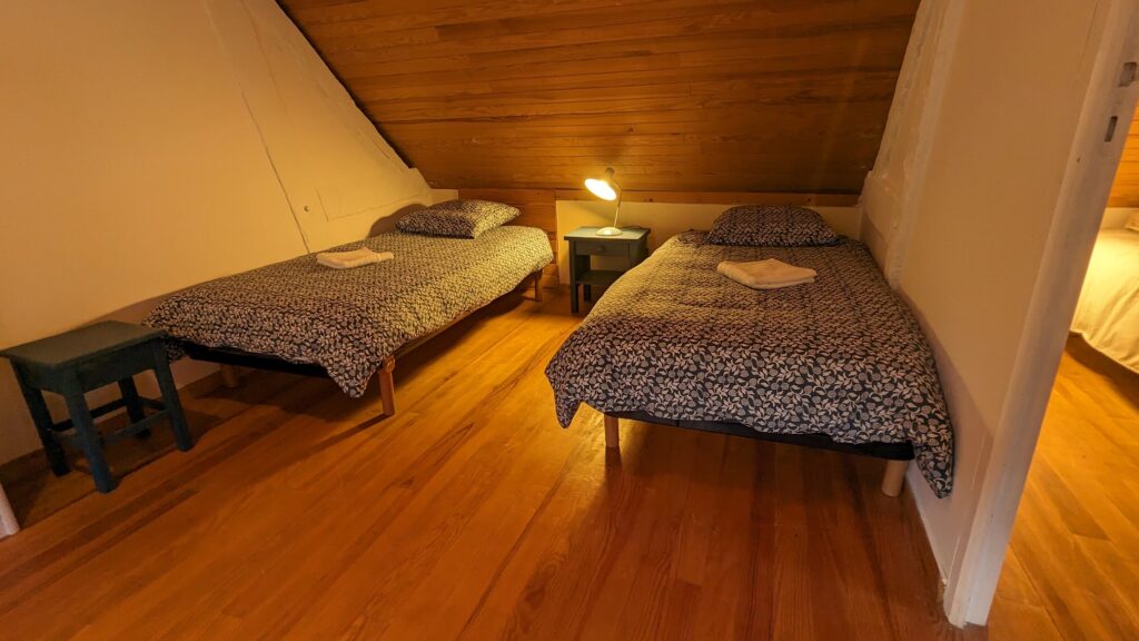 De l’autre coté, la chambre est orientée Est et comporte un grand lit double et deux lits simples. Sur le palier deux lits simples complètent l’étage. La capacité maximum de la maison est donc de huit couchages.